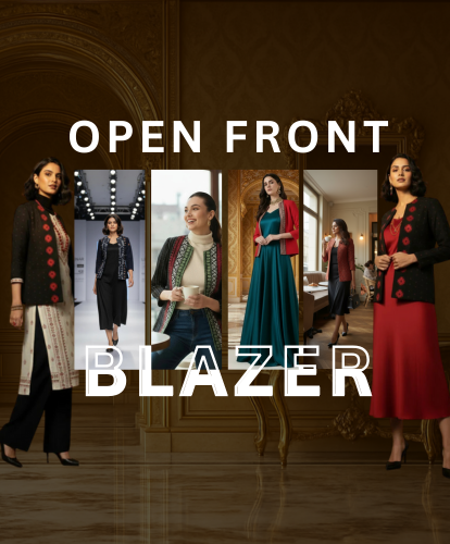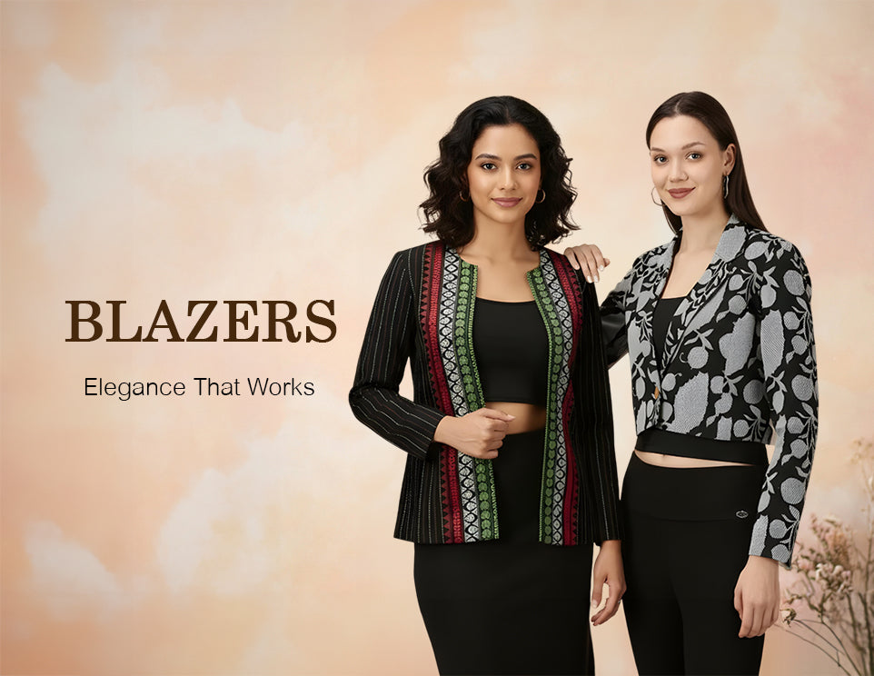 - Blazers: Our blazers redefine power dressing with heritage, handblock prints like Kalamkari & Ikat. Crafted in natural fabrics that breathe, these pieces prove professional polish and cultural pride aren't mutually exclusive. Perfect for women seeking Indo-Western fashion that makes an impact.