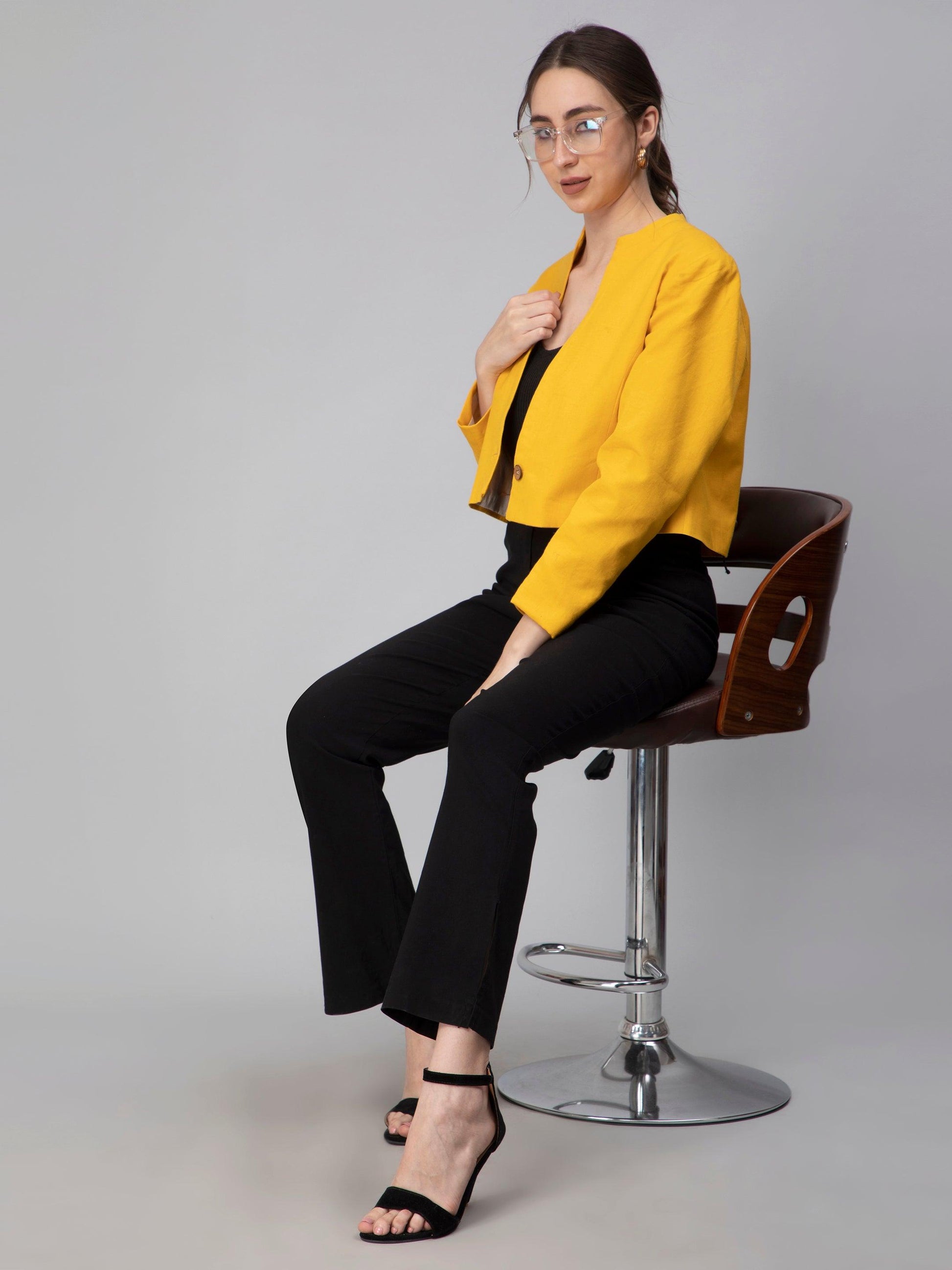 This vibrant yellow solid cropped cotton women's blazer is a statement piece that is perfect for adding a pop of color to any outfit. Made with high-quality cotton, it is breathable and comfortable, while its cropped design adds a touch of modernity. Perfect for dressing up or down, it is a versatile addition to any wardrobe.