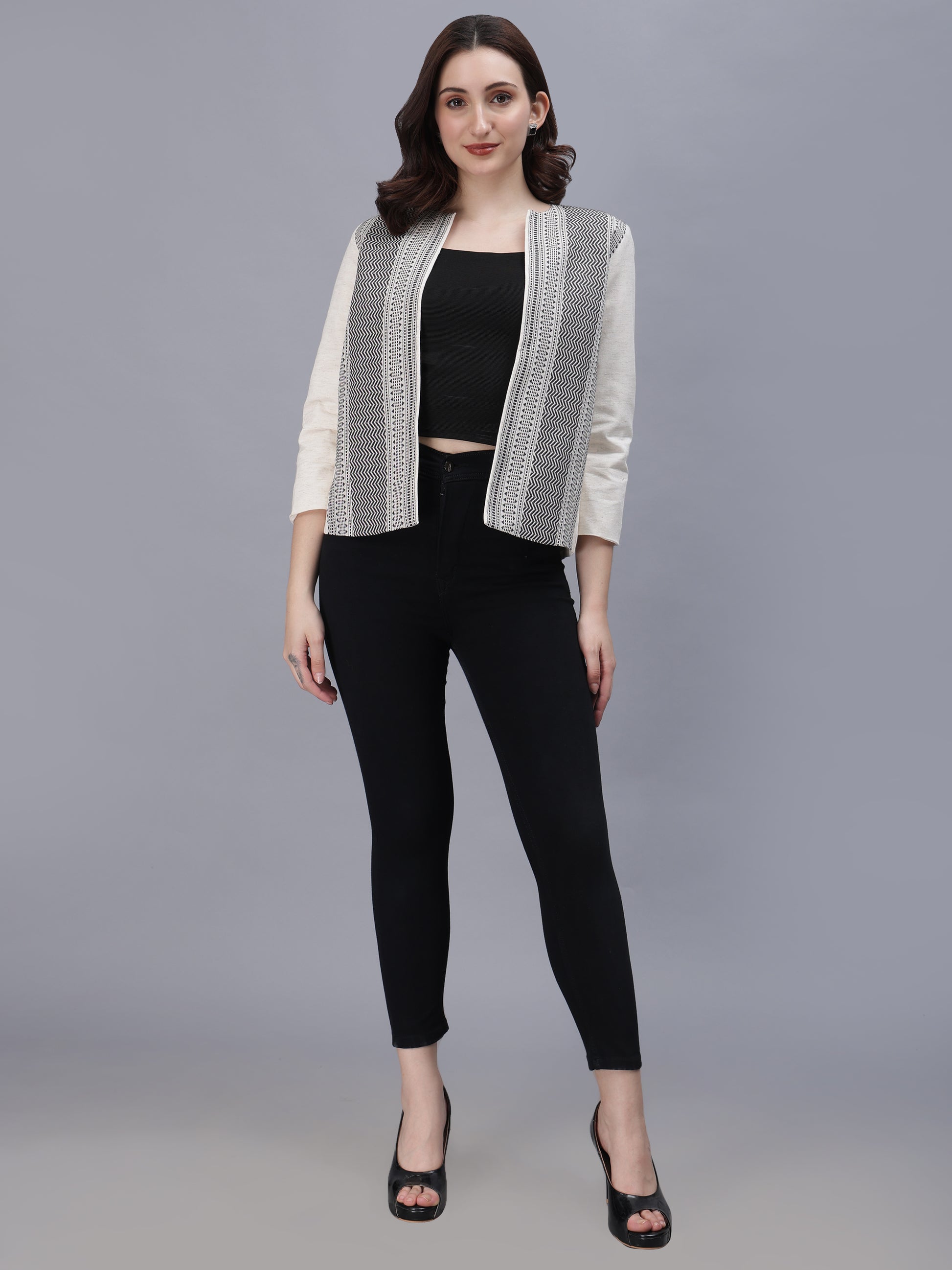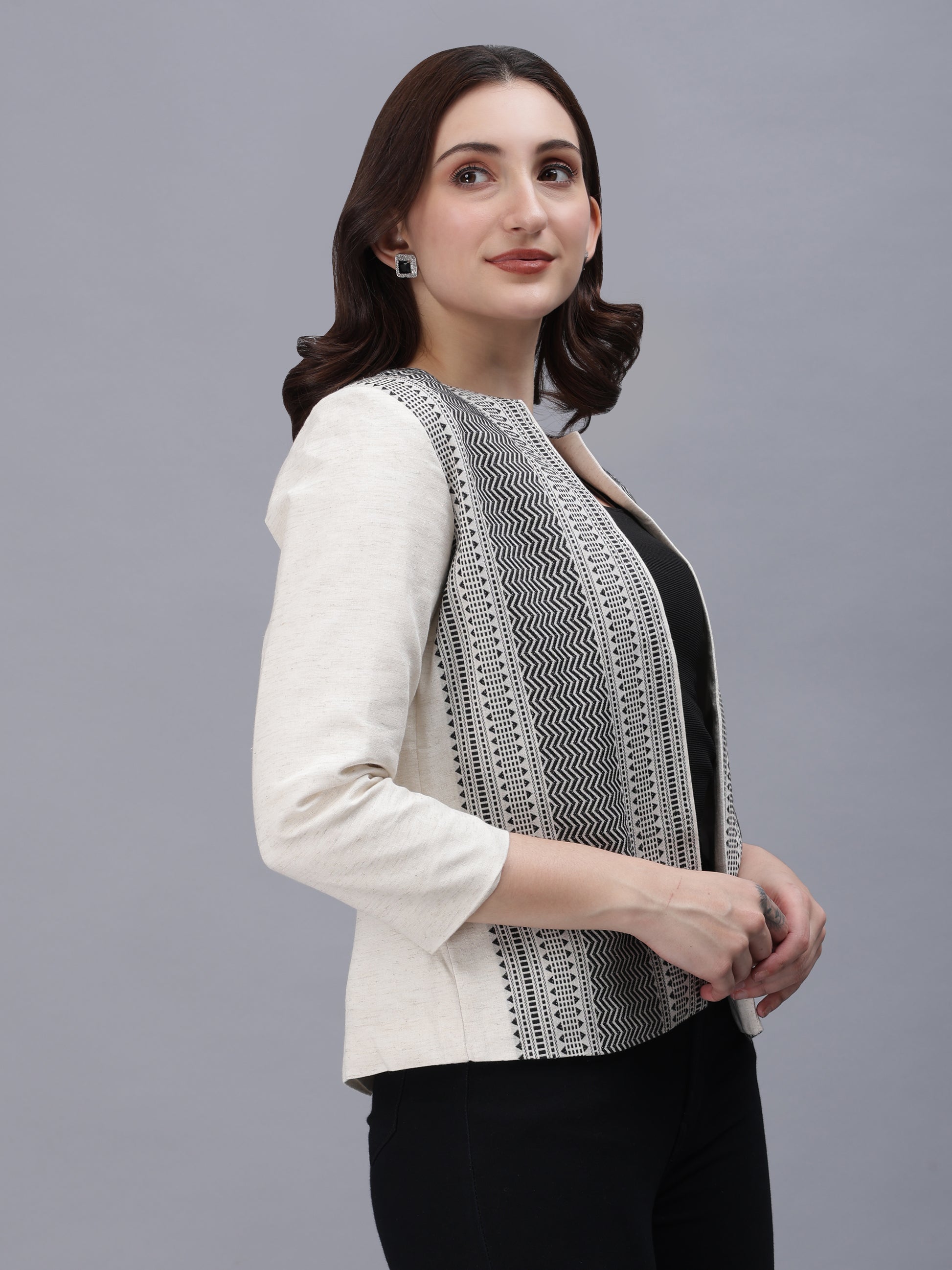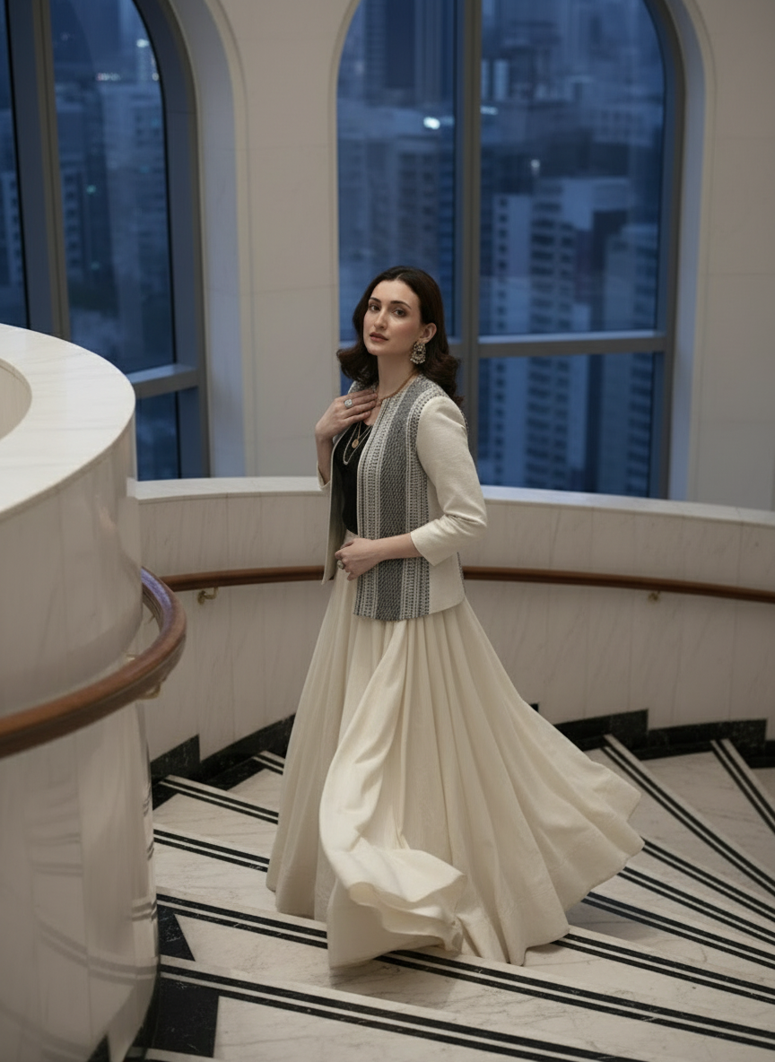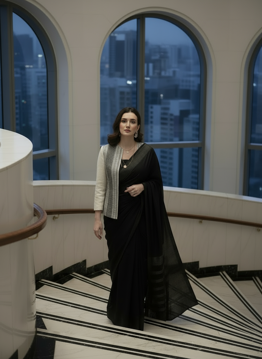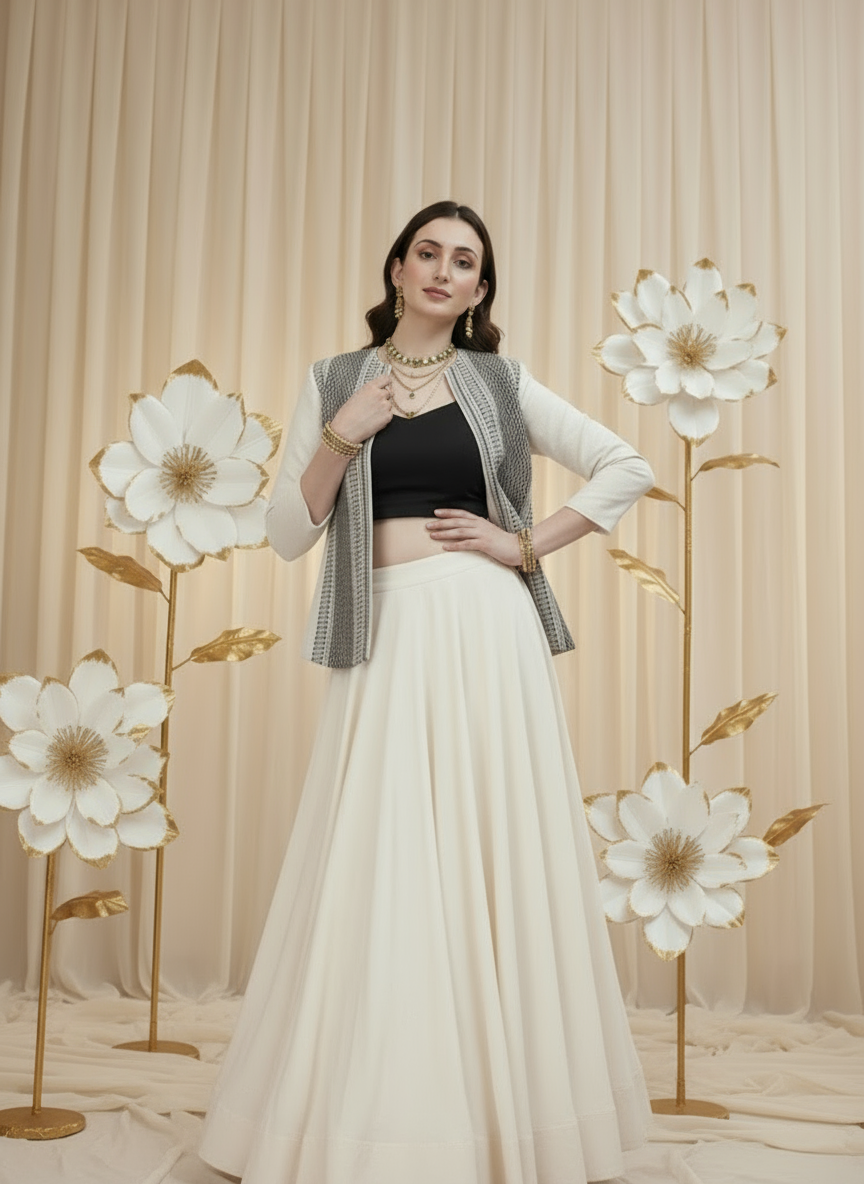 The open-front design drapes effortlessly — a nod to power dressing that moves from boardrooms to soirées with equal grace. Its monochrome palette makes it endlessly versatile — pair it with a saree, pencil pants, or denim to create your own signature style.