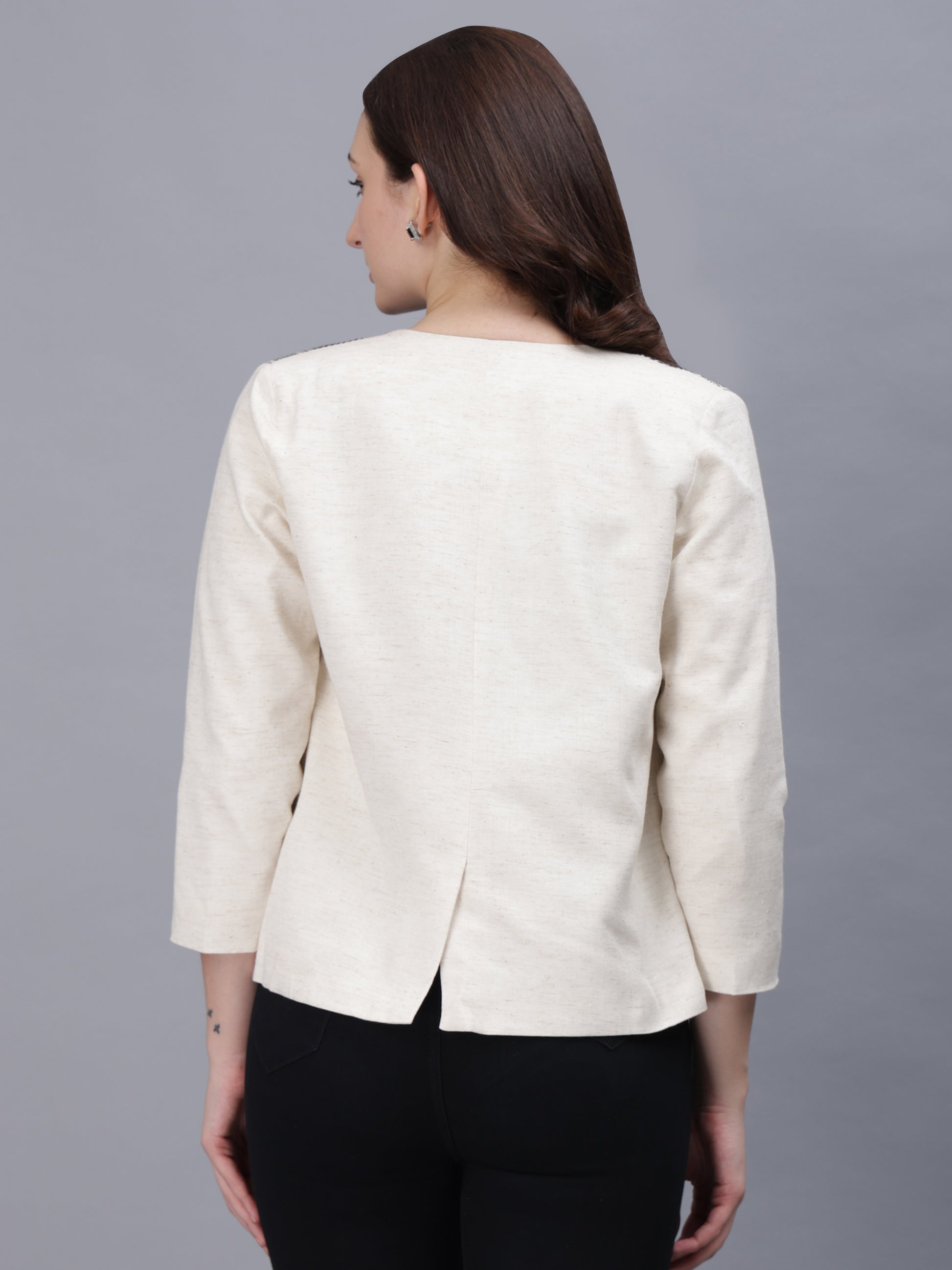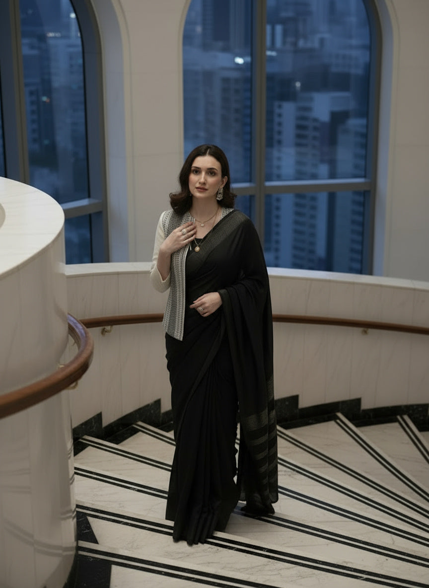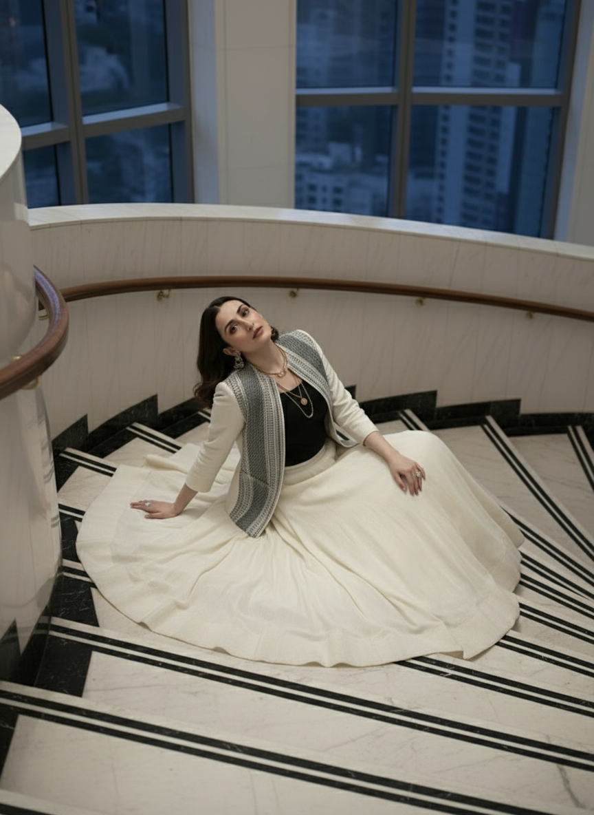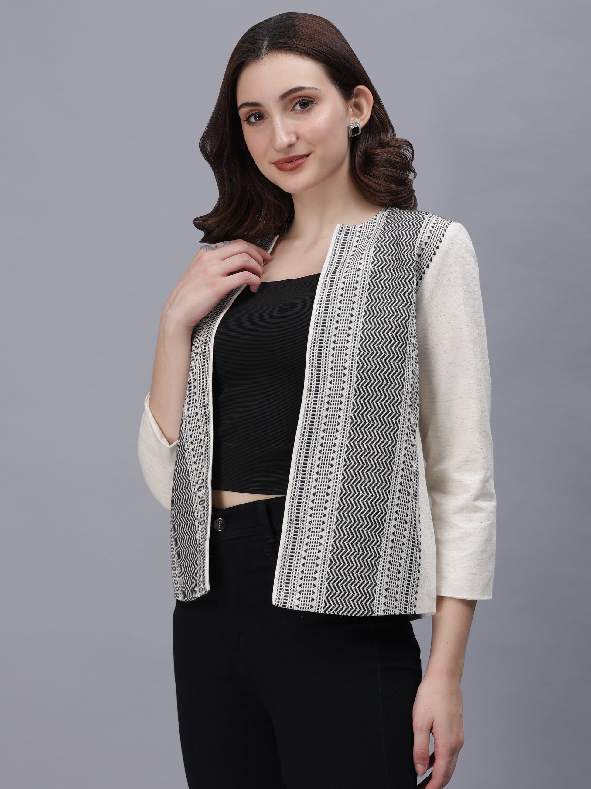 The open-front design drapes effortlessly — a nod to power dressing that moves from boardrooms to soirées with equal grace. Its monochrome palette makes it endlessly versatile — pair it with a saree, pencil pants, or denim to create your own signature style.