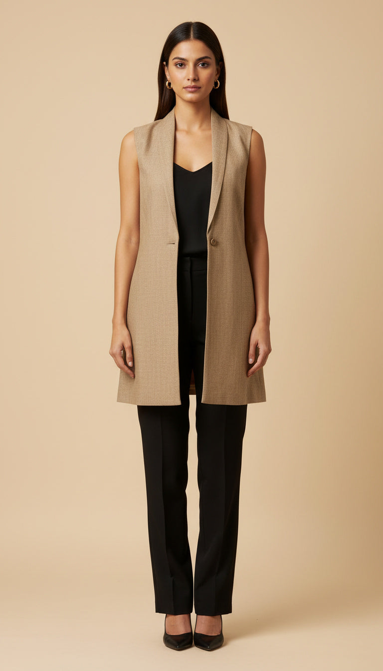 The AAROH Beige Overlay Shrug is a refined third layer designed to bring balance, elegance, and authority to everyday dressing. Crafted in a soft neutral beige, this structured sleeveless shrug adds instant polish without overpowering your outfit—making it a timeless essential for modern Indian wardrobes.