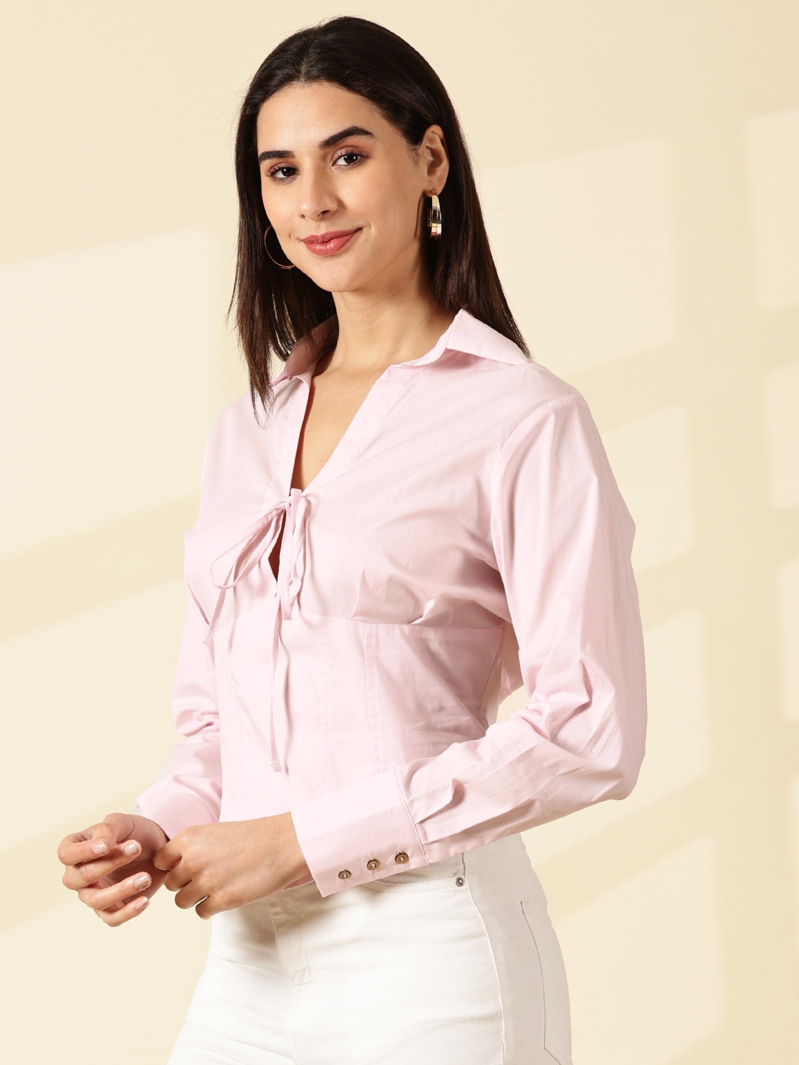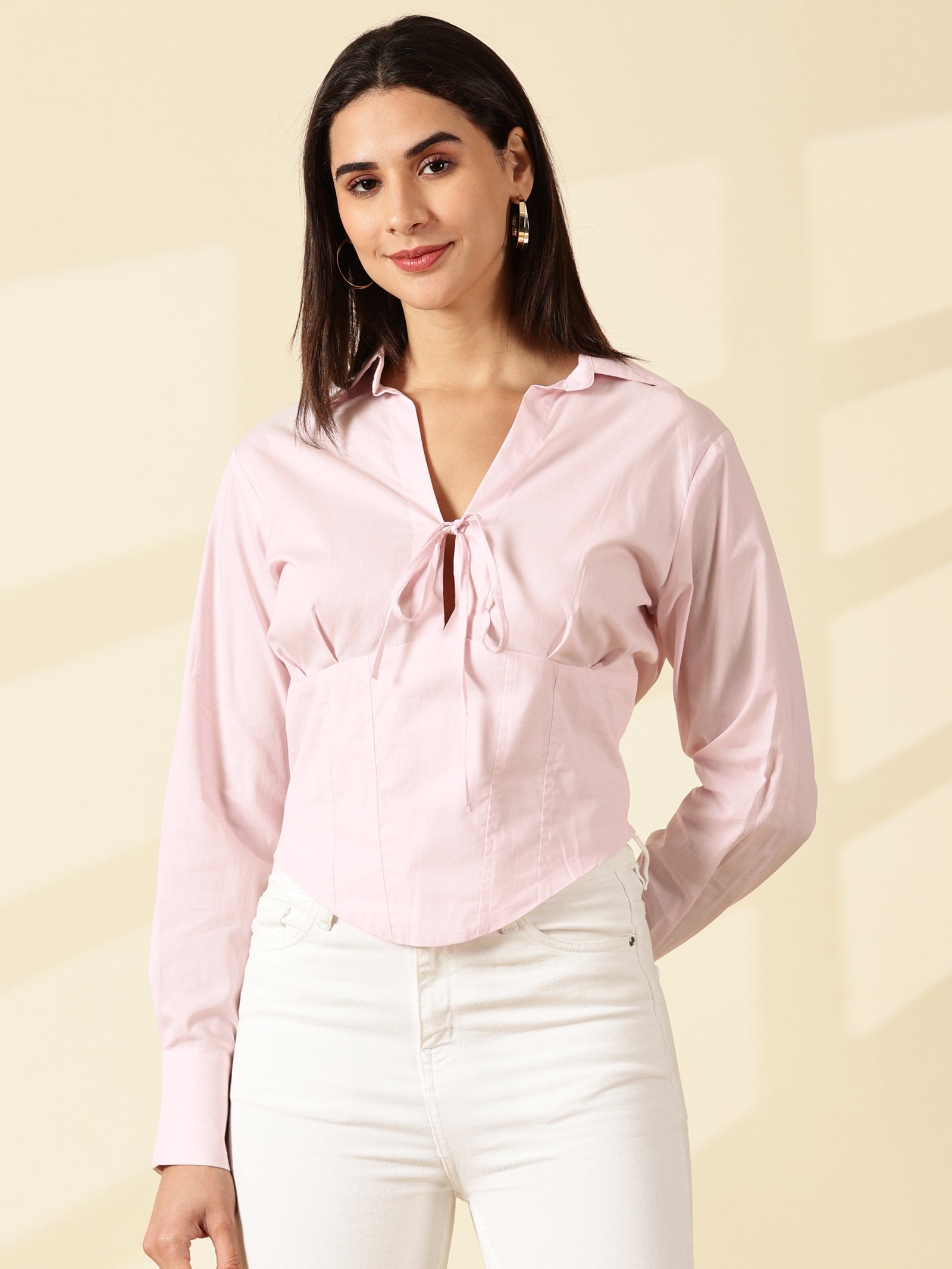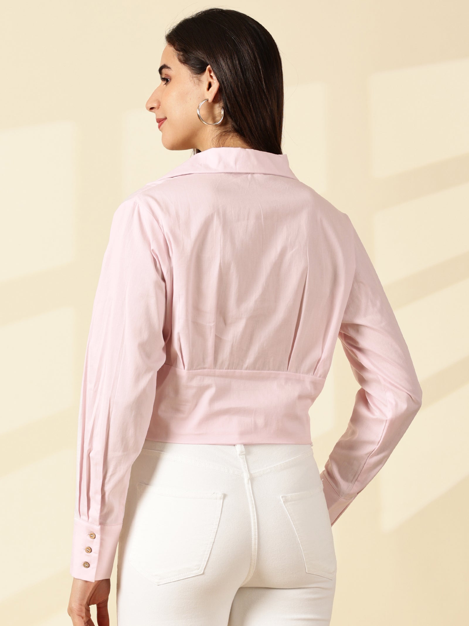 A crisp Baby pink solid casual crop shirt with a spread collar, long sleeves, and a curved hem for effortless style.