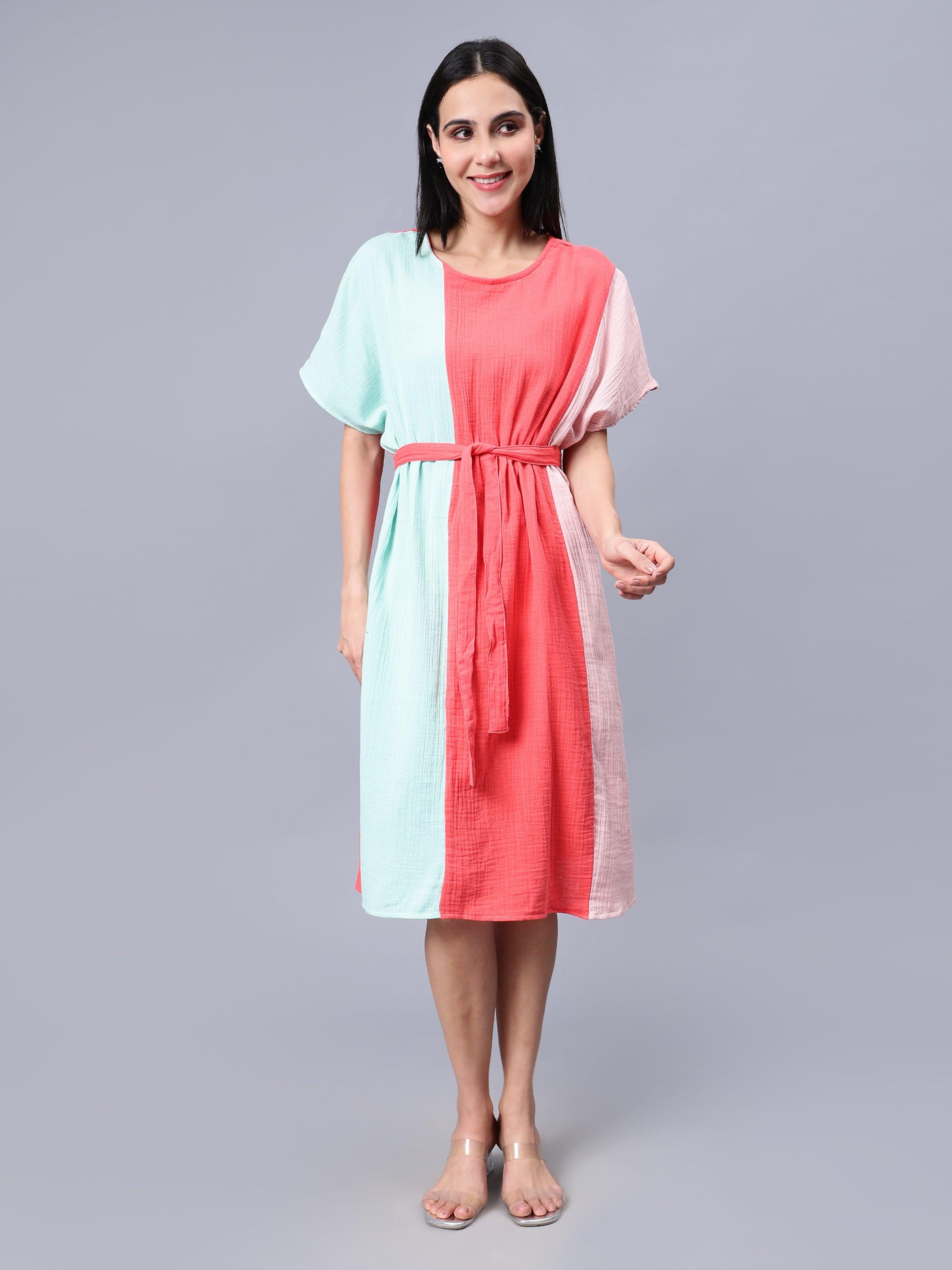 Women's Multi-Colored Cotton Colourblocked Kaftan Dress - Casual Short Sleeves Round Neck