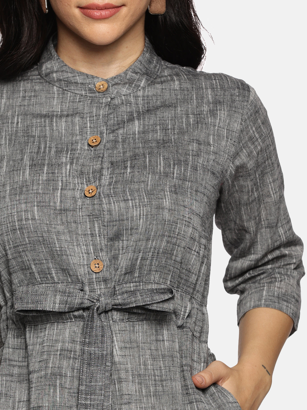 Designed with wooden buttons for a rustic touch, this dress adds a unique charm to your everyday look. Its simple yet elegant bottom print enhances its appeal, making it a versatile piece for any occasion, from a casual brunch to a day out with friends.