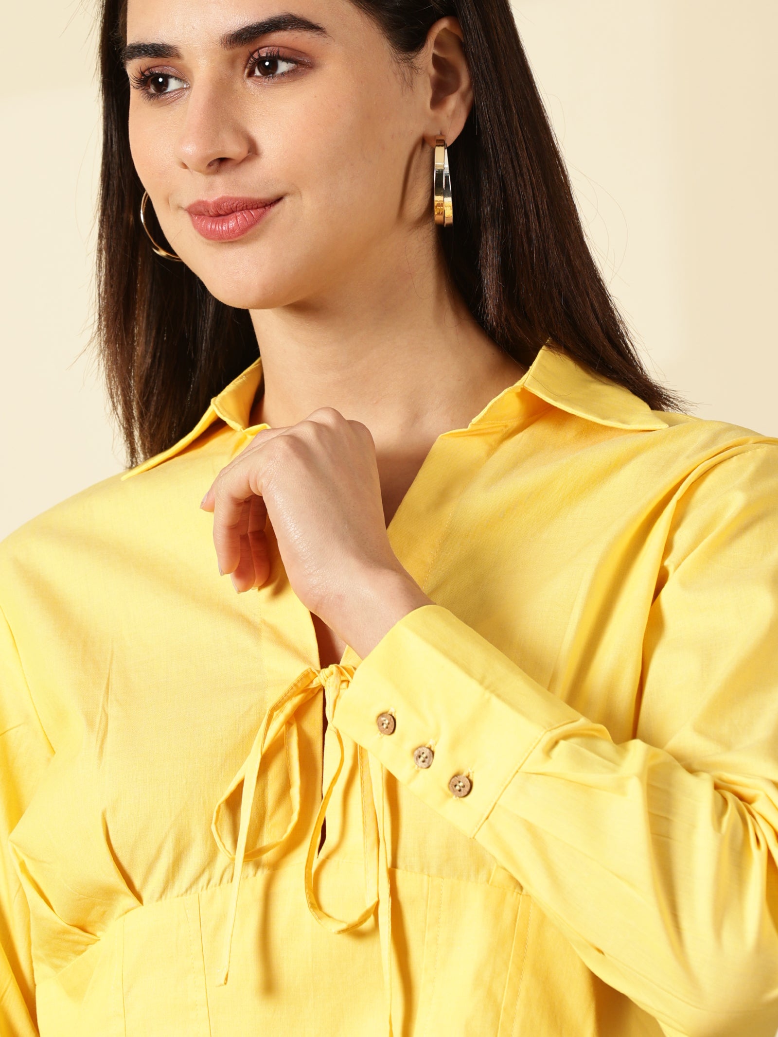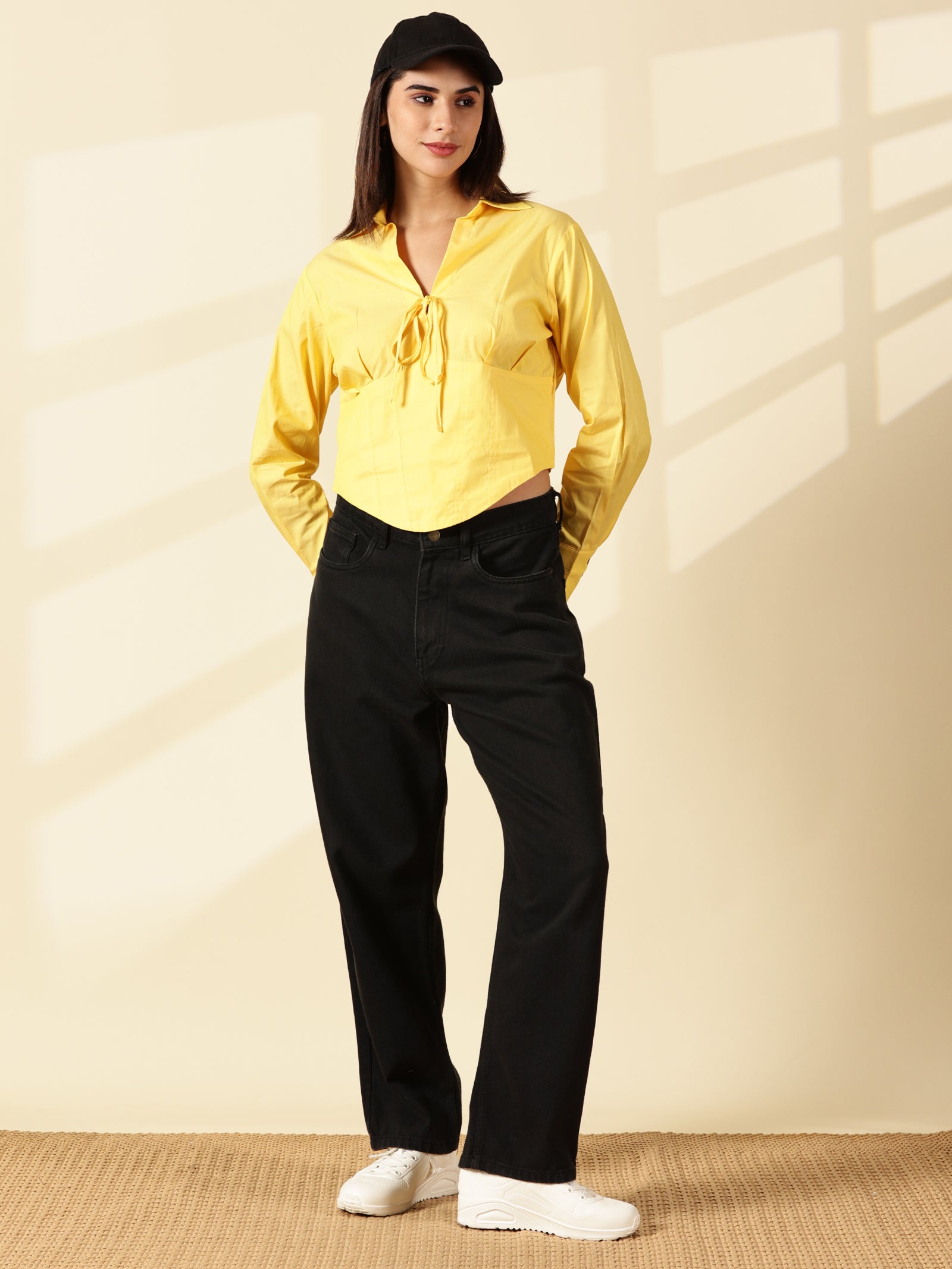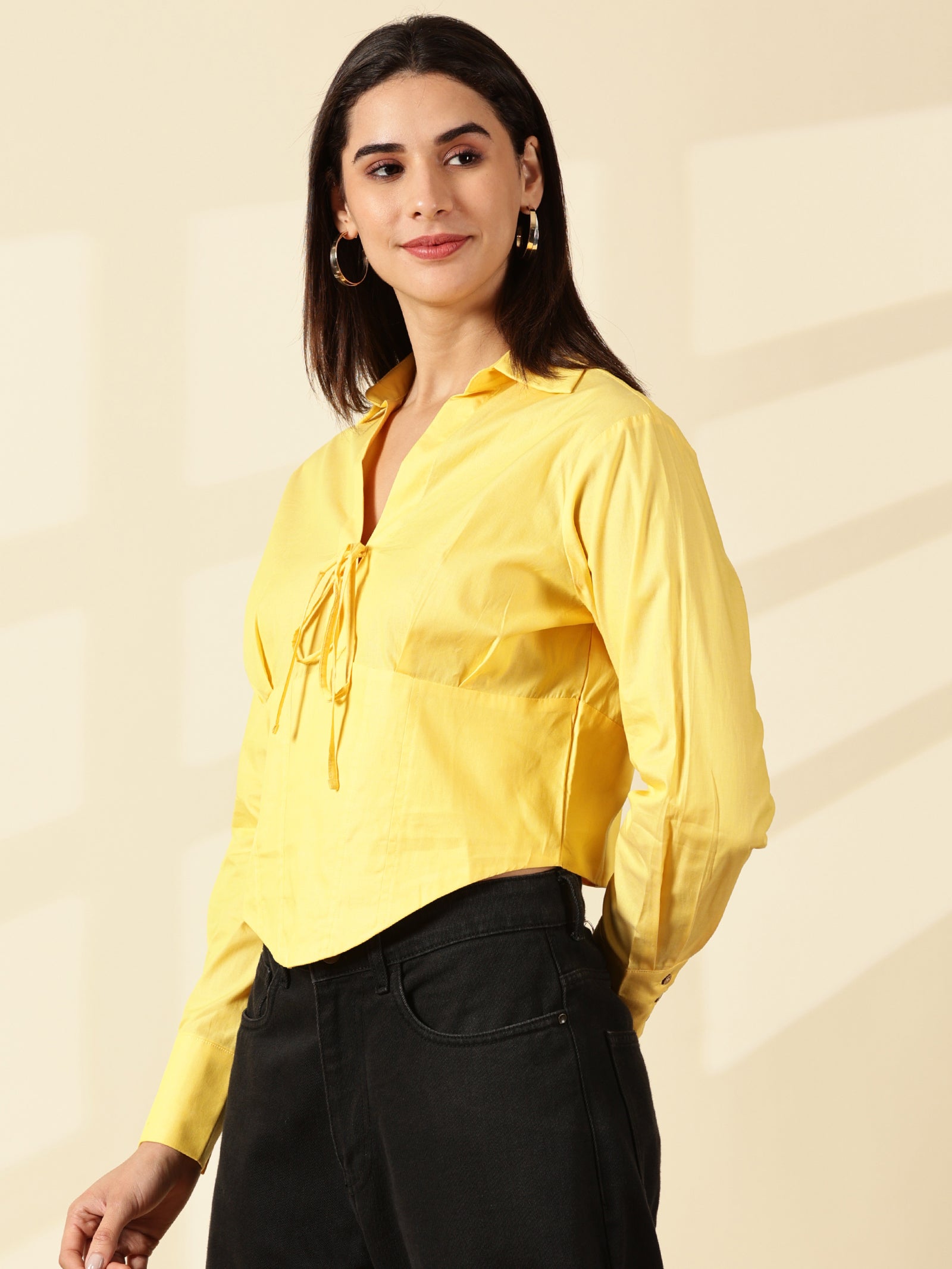A crisp butter yellow solid casual crop shirt with a spread collar, long sleeves, and a curved hem for effortless style.