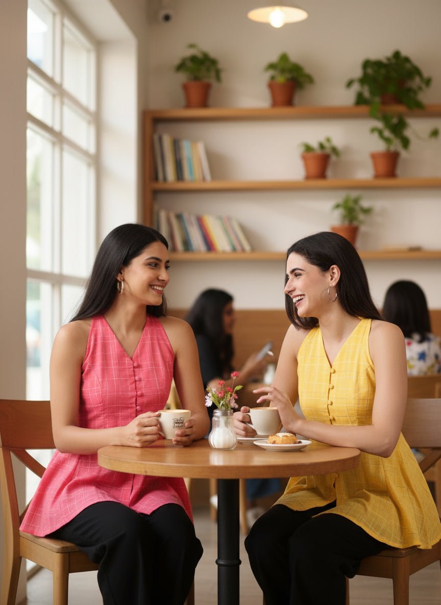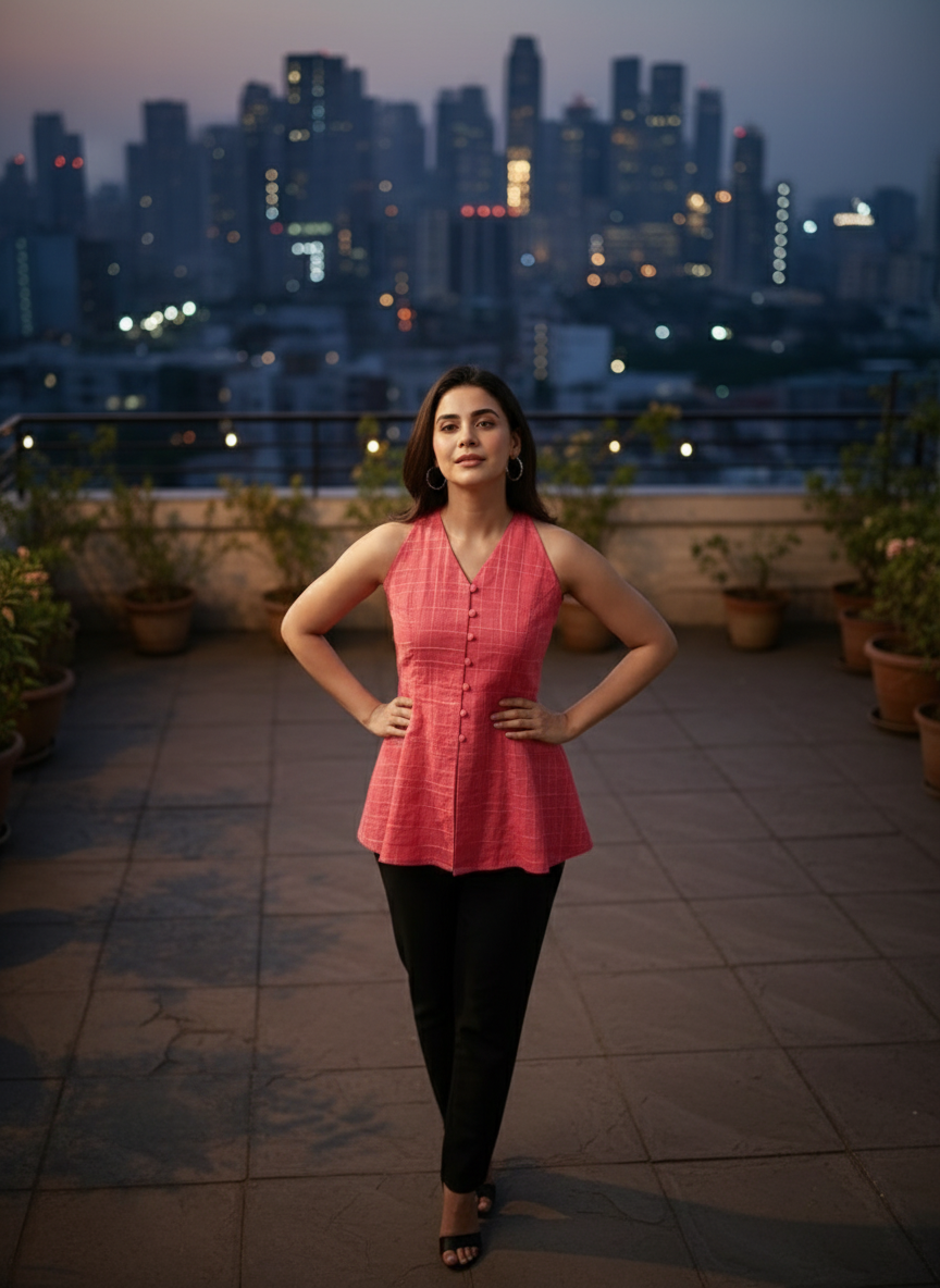 Bright, breezy, and full of warmth — the Indyvarna ANAGHA Halter Cotton Tunic in coral pink grid celebrates confidence wrapped in softness. Crafted from 100% pure cotton, it’s lightweight, breathable, and made to move with you through sunlit days and easy evenings.