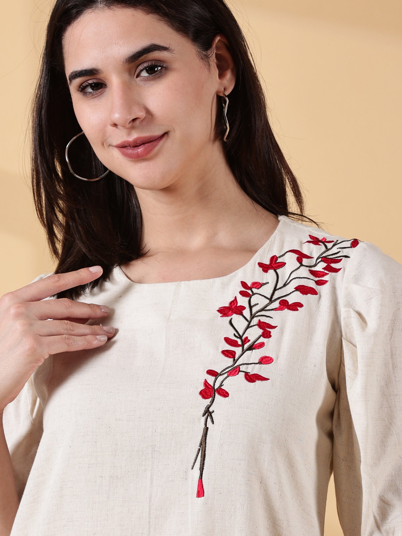 Embrace understated elegance with the Indyvarna Anvi Cotton Embroidered Ivory Bloom Kurta, where simplicity meets timeless artistry. Crafted from 100% pure cotton, this A-line silhouette features delicate red floral embroidery along the neckline and softly gathered puff sleeves for a feminine touch.
