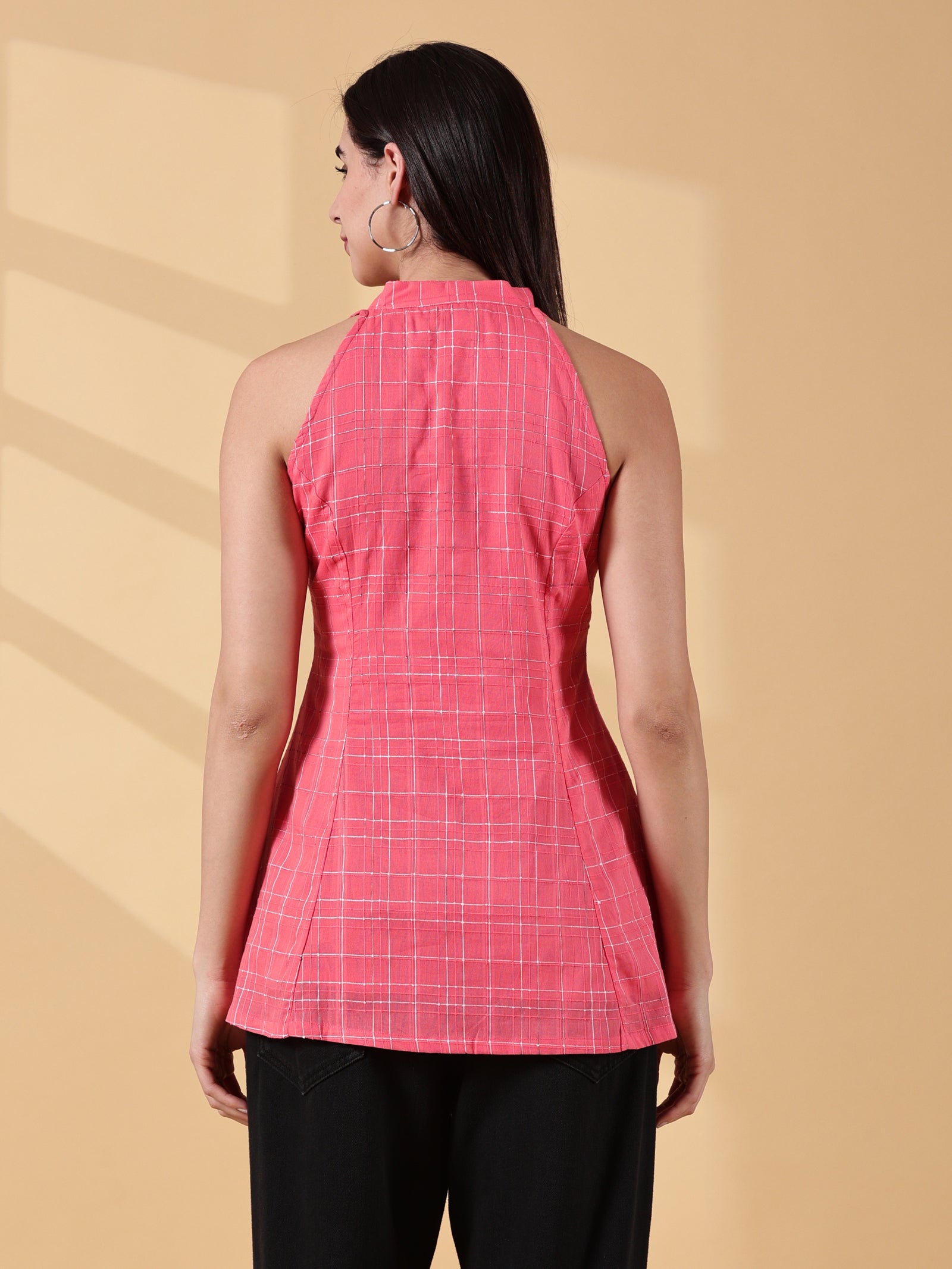 Bright, breezy, and beautifully tailored — the Indyvarna Anagha Halter Cotton Tunic in coral pink with delicate white grid lines is a perfect blend of comfort and chic. Made from 100% pure cotton, it’s soft, breathable, and ideal for all-day wear.