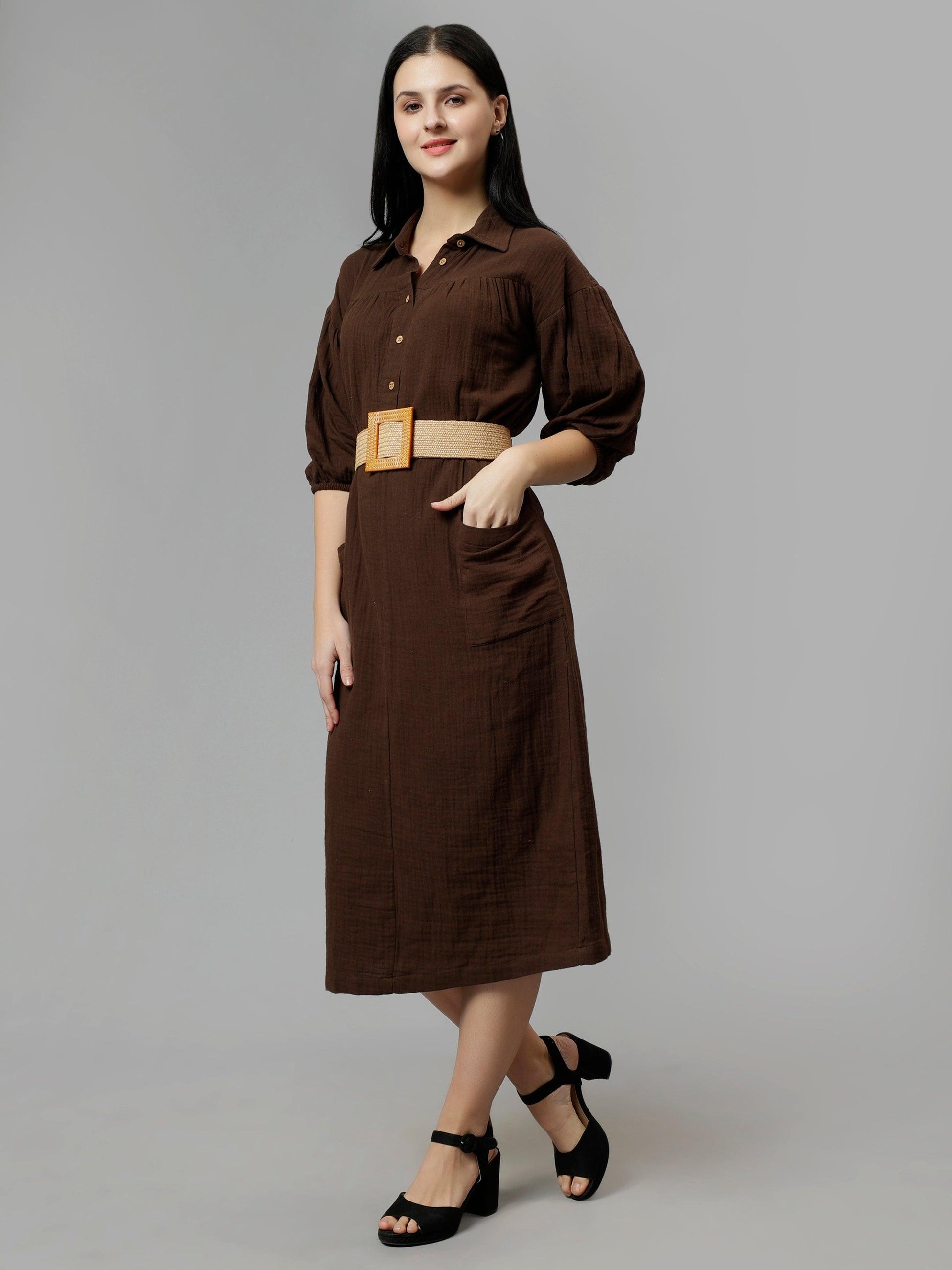 Women's Brown Cotton Solid A-Line Midi Dress - Casual Three-Quarter Sleeves Button Closure