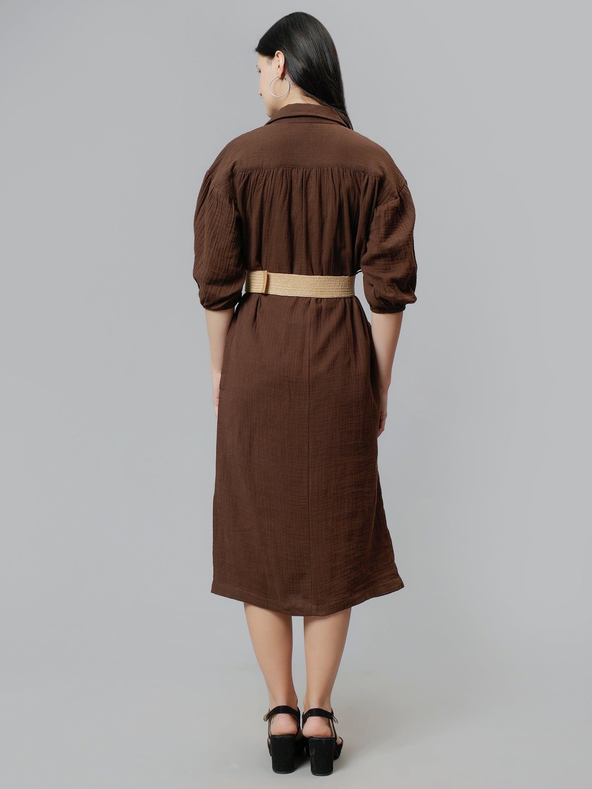 Elevate your summer wardrobe with our chic Brown shirt dress from Dress for Indyvarna. Crafted from luxurious double cloth cotton fabric, this dress offers extreme comfort without compromising on style. Featuring 3/4 sleeves and a classic shirt collar, it exudes timeless elegance. The addition of a jute belt adds a touch of sophistication, creating a stylish focal point. With its mid-ankle length, this dress effortlessly combines comfort and elegance, making it ideal for both casual outings and semi-formal occasions. Embrace the season in this versatile piece that seamlessly transitions from day to night, ensuring you look effortlessly stylish wherever you go. Shop now to add this must-have summer staple to your wardrobe!