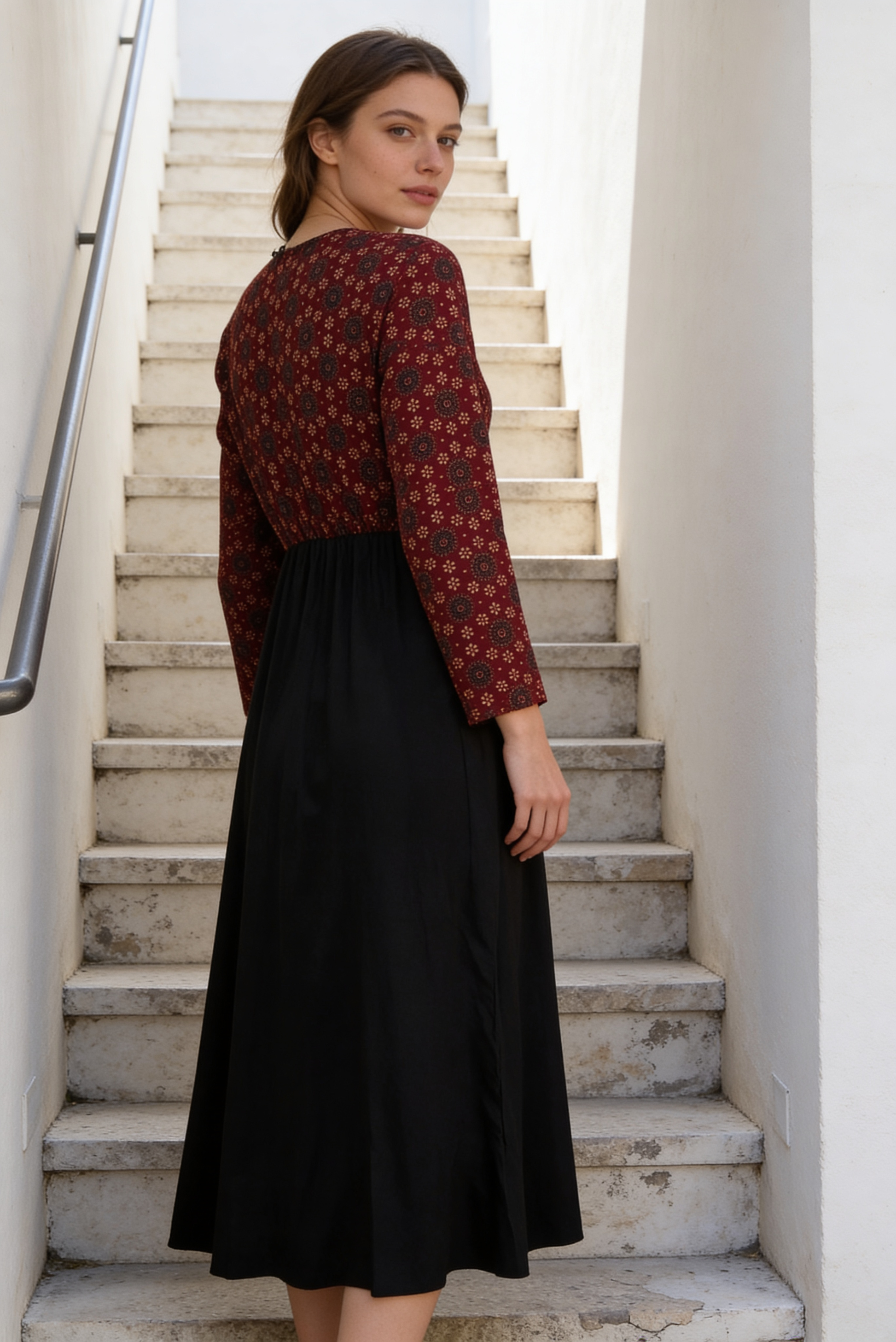 Black & Ajrak Cotton Colorblock Midi Dress – Indyvarna