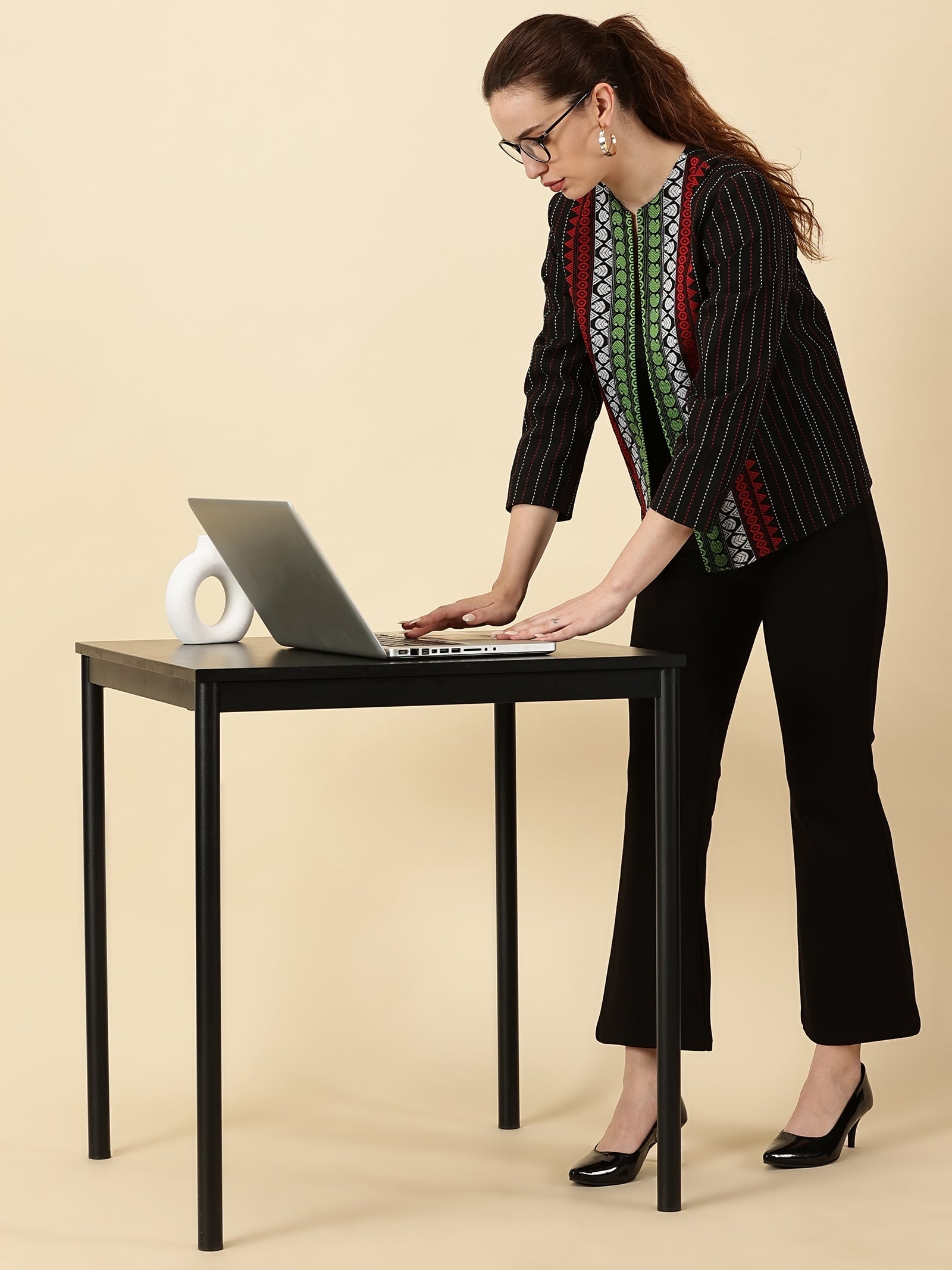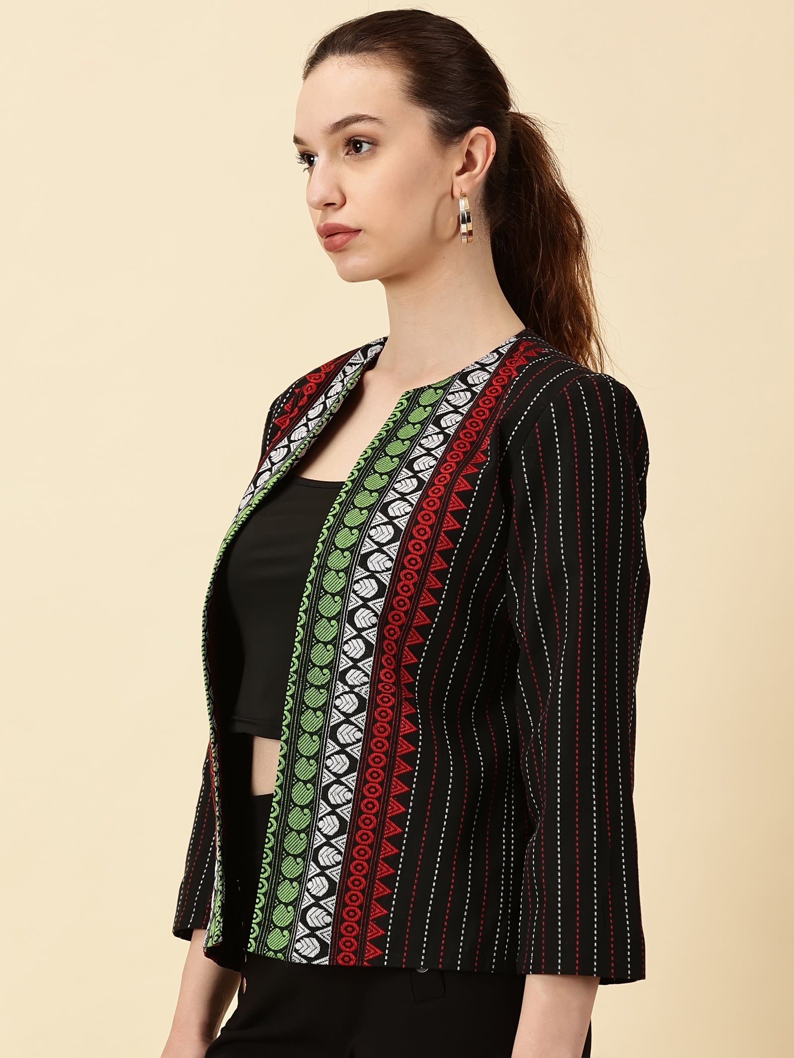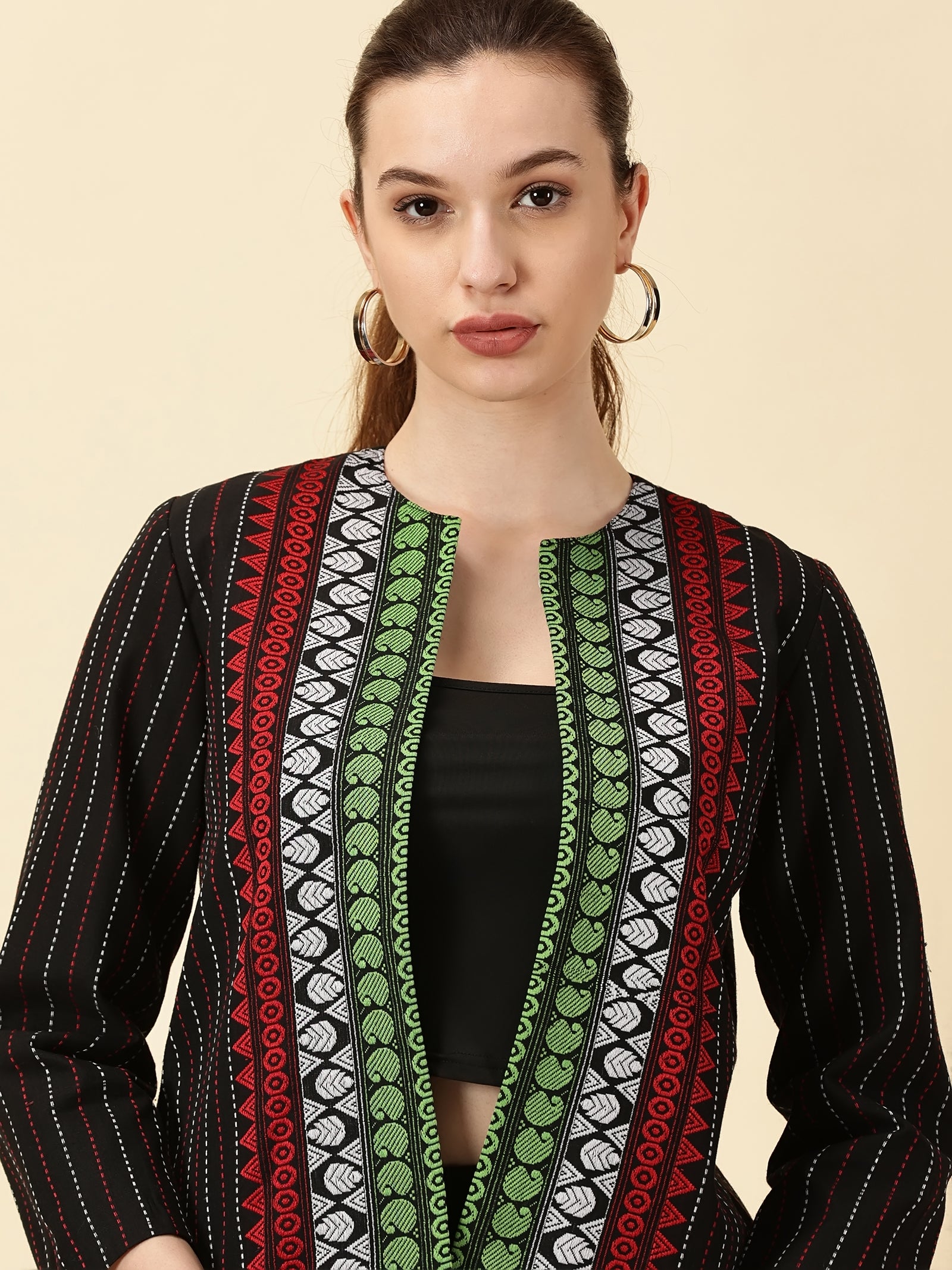 Bring culture to the boardroom with this striking open-front blazer crafted in rich South cotton. Featuring intricate handloom printed borders mix with red, green, and black, this blazer blends tradition with trend like no other. The no-collar silhouette and bold color play make it a standout piece for work or a night out.