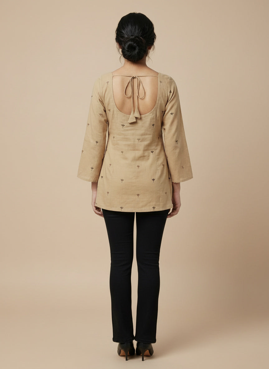 The soothing warm beige hue is elevated with delicate, minimal motifs, making it versatile yet distinctive. Featuring a deep U-back neckline with tie-up detailing, this kurti adds a subtle statement to an otherwise classic silhouette. The full-length sleeves bring balance and refinement, while the straight, tailored fit ensures comfort without compromising on polish.