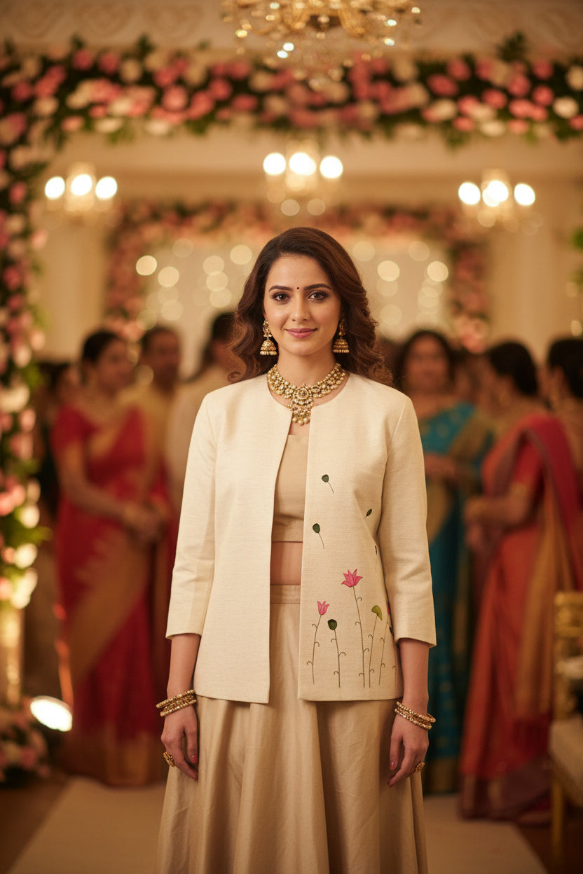 Open Front Cotton Blazer-White Beige Hand painted – Indyvarna