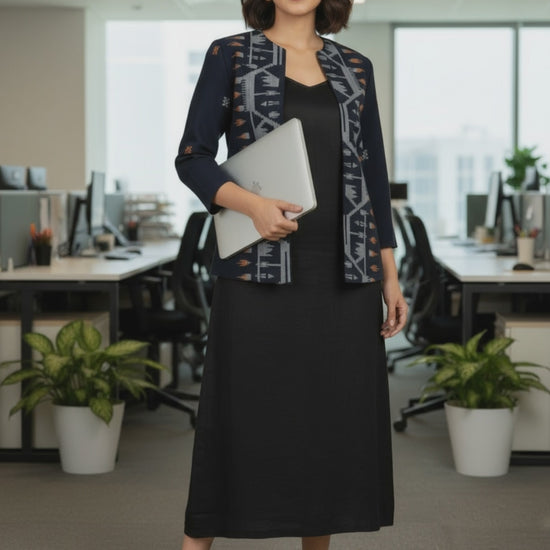 Meet the Navy Ikat Handwoven Open Front Cotton Blazer – Rekha Edition— where Indian weaving meets modern power dressing. Made from soft, breathable handwoven cotton, this navy Ikat blazer adds instant polish to any look.