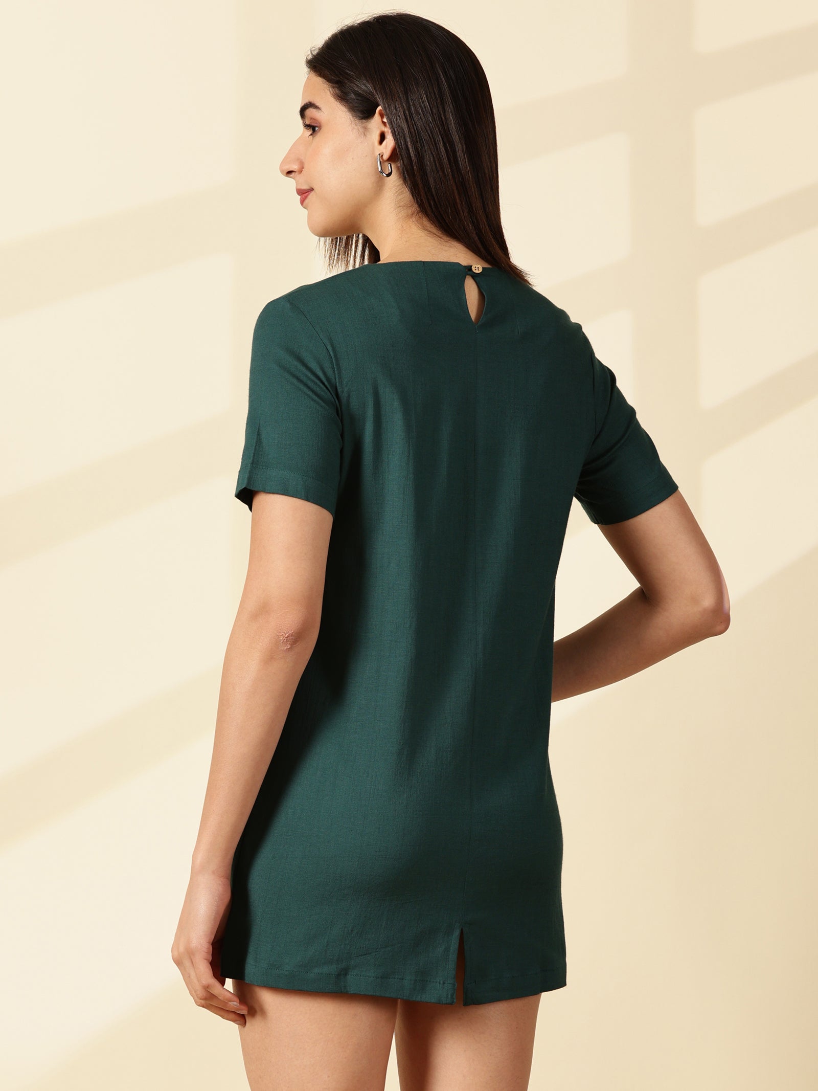 Fresh, playful, and easy to wear — this  green cotton dress brings comfort and charm together. Designed with a relaxed silhouette and cute floral embroidery on the pockets, it’s the kind of outfit that works just as well for a coffee run as it does for a casual day out. Lightweight and breathable, it’s your go-to pick when you want effortless style with a touch of whimsy.