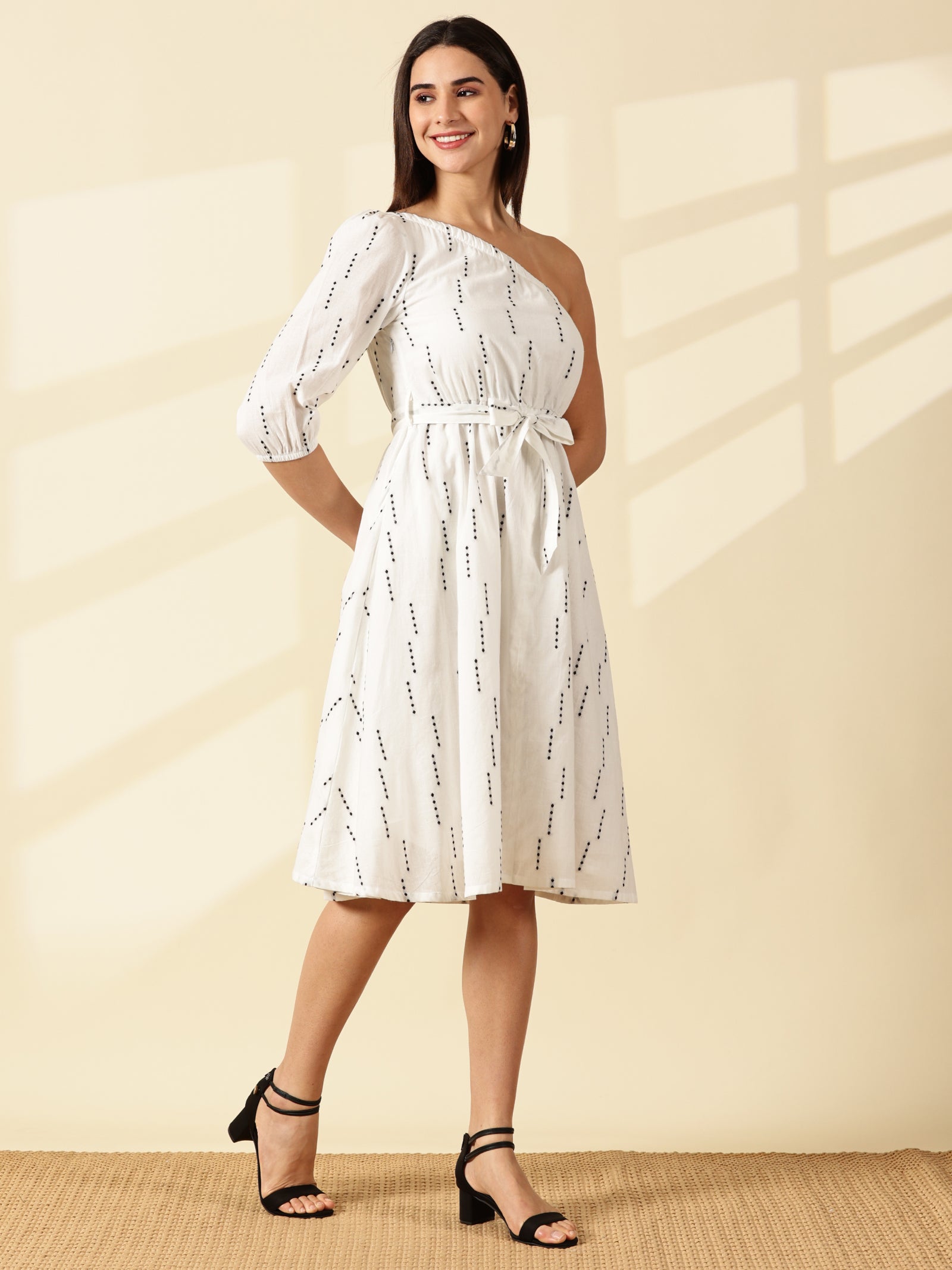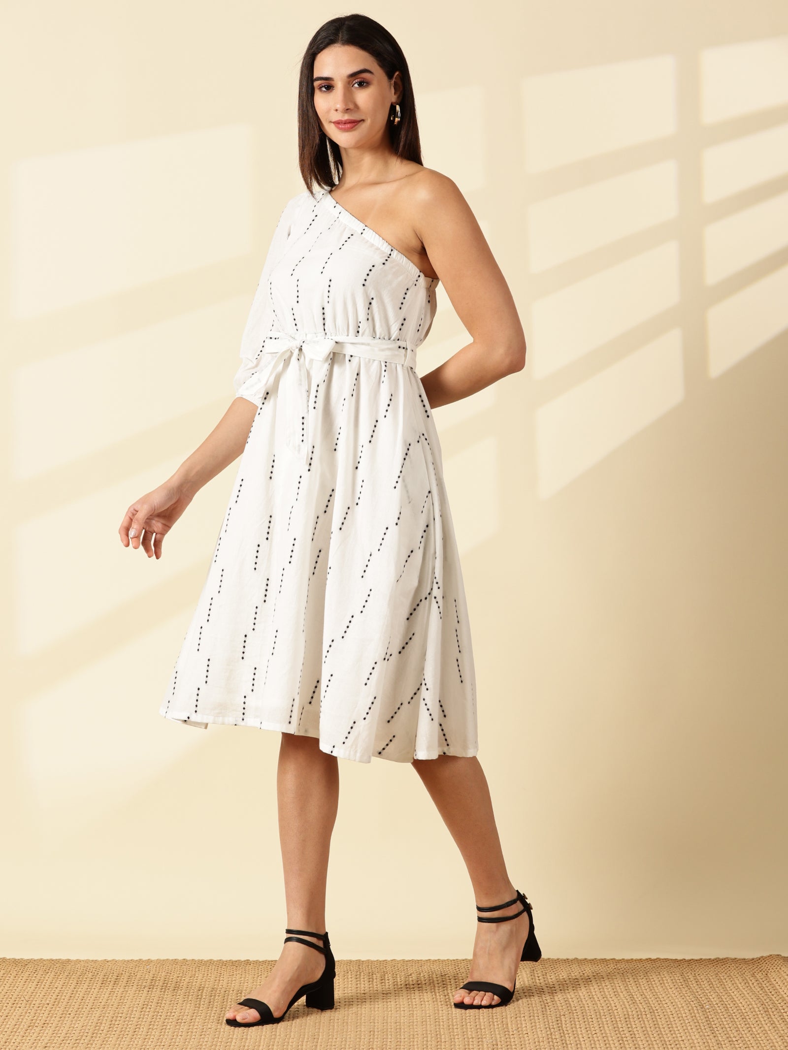 Selene One-Shoulder Midi Dress is inspired by moonlit charm. A chic handwoven white midi dress featuring a stylish one-shoulder design with tie-ups and a flattering A-line silhouette.